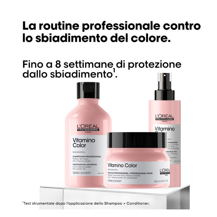Proteggete il colore dei vostri capelli dallo sbiadimento fino a 8 settimane con L'Oréal Professionnel Vitamino Color Trio. La formula professionale dei suoi 3 prodotti contiene resveratrolo, un potente antiossidante che previene gli influssi ambientali dannosi.