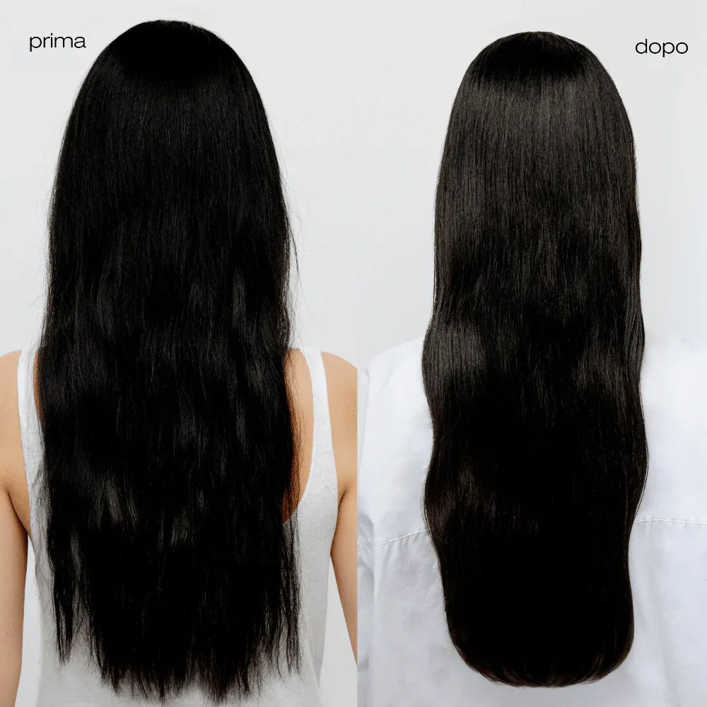Capelli visibilmente più sani dopo 3-4 applicazioni. Le doppie punte appaiono sigillate e meno evidenti. La fibra risulta più resistente alla trazione e meno soggetta a rottura. La superficie del capello diventa liscia e riflette meglio la luce.