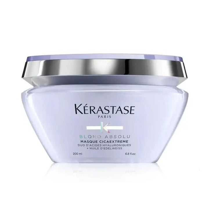 Post bleaching repairing mask for sensitized, lightened or bleached hair . Plumps and regenerates the hair fiber preventing the formation of split ends and breakage leaving hair with a healthier appearance. With hyaluronic acid and Edelweiss oil, it guarantees deep hydration and excellent combability. Kerastase Blond Absolu Masque Cicaextreme leaves blonde hair smooth, strong and shiny.
