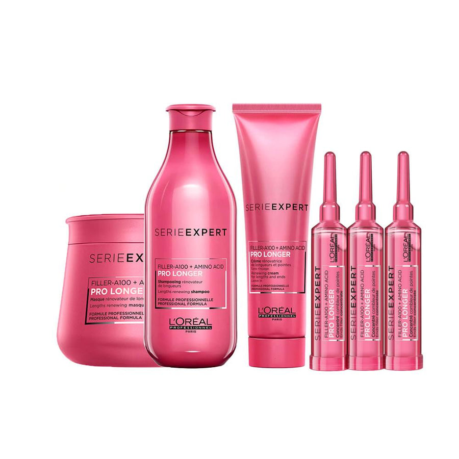 Serie Expert Pro Longer Hair Care Set L'Oreal Professionnel strengthens the fiber, prevents breakage and reduces split ends for stronger , more beautiful and protected hair. The shampoo, mask, serum and cream to take care of your long hair from cleansing to styling to show off healthy and shiny hair.