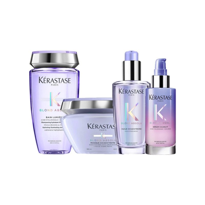 Il set per la cura dei capelli biondi. Kerastase Blond Absolu Kit Shampoo Maschera Siero e Olio contiene 4 prodotti di alta qualità,formulati con acido ialuronico e la stella alpina, per capelli biondi danneggiati, decolorati e con mèches. Lo shampoo deterge delicatamente la fibra lasciando i capelli leggeri e brillanti. La maschera riparatrice rimpolpa e rigenera la fibra capillare. Il siero sfrutta il potere riparatore del riposo notturno per fornire il nutrimento intensivo di cui le fibre indebolite hanno bisogno per rimanere belle, vibranti, morbide e piene di vita. L’olio per capelli offre un trattamento profondo con protezione termica fino a 230°. Sigilla istantaneamente le cuticole e riduce drasticamente le doppie punte, nutrendo la fibra dall'interno. I capelli sono istantaneamente rafforzati e brillanti.