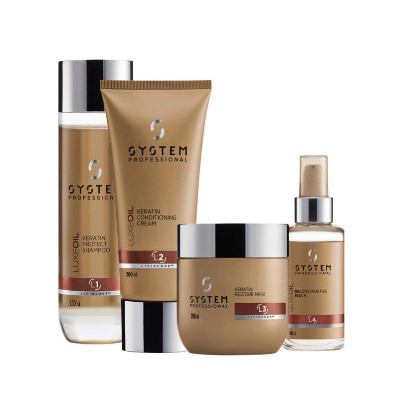 Un kit di lusso per i capelli, formulato con oli di Argan, Jojoba e Mandorle. System Professional Luxe Oil Kit Trattamento Ricostruttivo Capelli, ripara e ricostruisce le aree indebolite della fibra capillare per renderle più forti. Inoltre, controlla il crespo e dona lucentezza e morbidezza