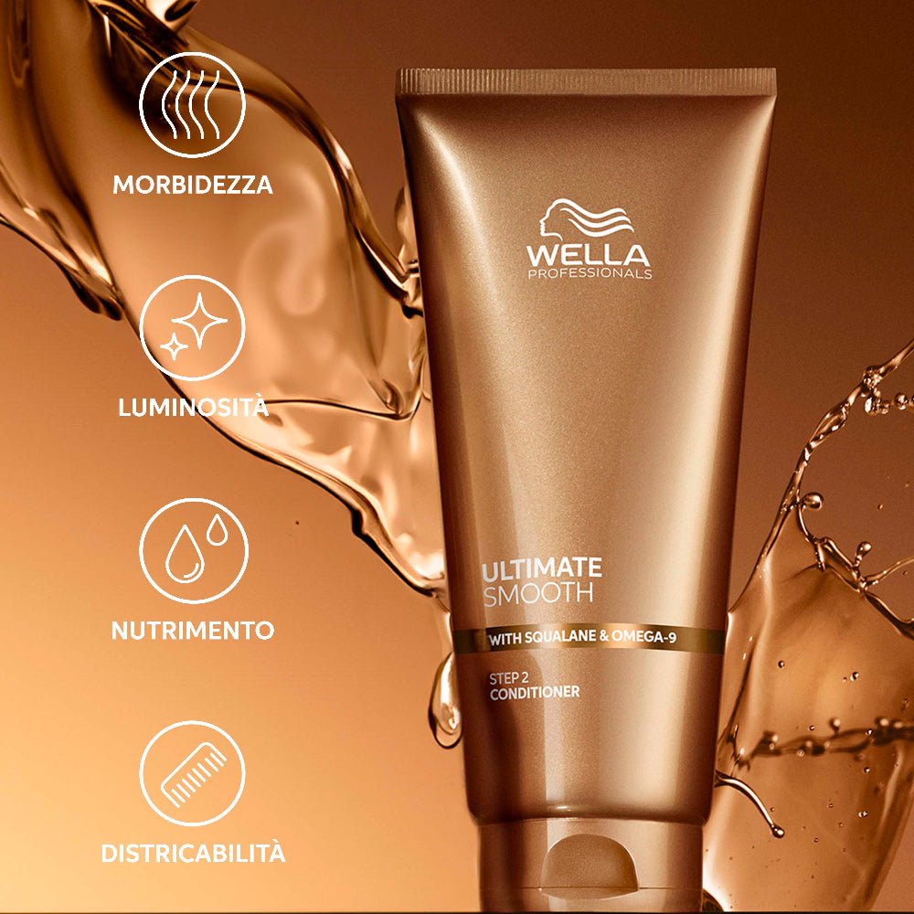 Ultimate Smooth Balsamo anticrespo Wella Professionals, un balsamo anticrespo lisciante professionale progettato per domare i capelli crespi e restituire loro luminosità e morbidezza. Questo trattamento professionale è la soluzione ideale per chi desidera capelli nutriti e lisci, perfetti per ogni occasione.