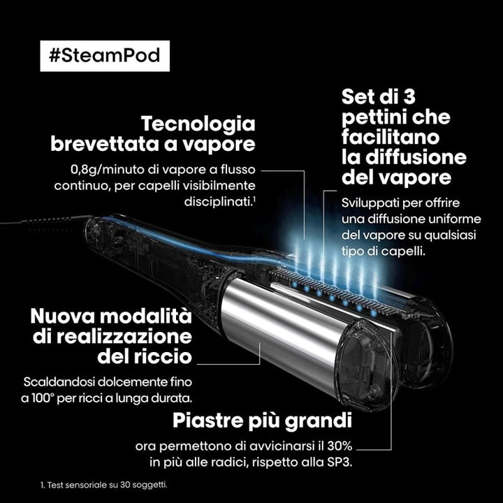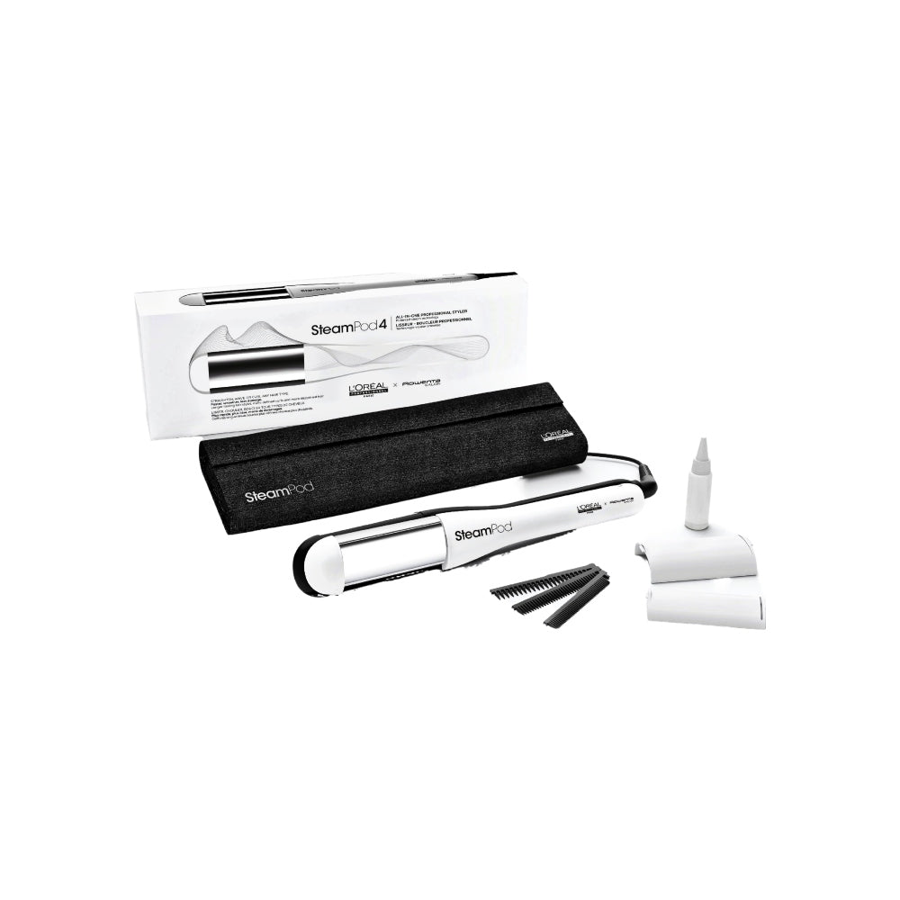 The new straightener that offers a multitude of looks for all hair types . L'Oreal's Steampod 4.0 Professional Steam Straightener lets you straighten, curl, or wave. An even more efficient, innovative, and ergonomic tool that ensures maximum respect for the hair fiber. The brand new steam hair straightener opens up a multitude of looks! Unlimited styling, suitable for all hair types! It combines innovation and professionalism, ensuring shine and softness to the hair fiber. It is even more advanced and ingenious, thanks to the new external heating plates and the new ergonomic design. It optimally respects the hair fiber, accelerating styling times for a transformation that is 3 times faster, 2 times more manageable, and with 95% less damage. Thanks to the external heating plates, with thinner and rounded ends, it offers more voluminous and better-defined curls. The plates are also wider than previous versions, allowing them to be positioned 30% closer to the roots, ensuring optimal and effortless straightening of the entire head of hair. This smart straightener features an automatic shut-off function that provides a certain level of safety in case you forget to turn it off. It turns off after 30 minutes of non-use. Its temperature ranges from 180° to 210°C, adapts to all hair types, and guarantees heat control 250 times per second to display a precise temperature on the device.