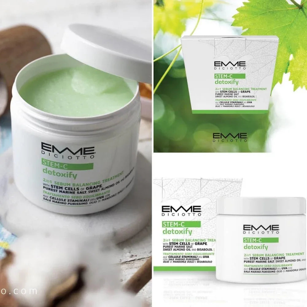 Emmediciotto STEM-C Detoxify 2in1 Sebum è un prodotto versatile arricchito con cellule staminali vegetali attive dell'uva, sale marino purissimo e bisabololo, che rendono il cuoio capelluto sano e pulito.
