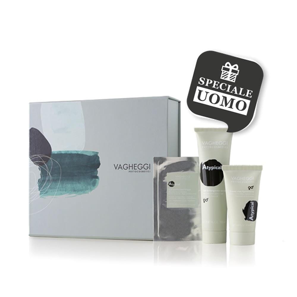 Una confezione regalo dedicata all’uomo contenente un detergente scrub, una crema viso e una maschera per borse e occhiaie. Per una routine essenziale ed efficace, rappresenta un nuovo approccio cosmetologico. Vagheggi Atypical Kit Viso-Occhi Rigenerante Antiaging con note olfattive unisex, per una pelle fresca e protetta.