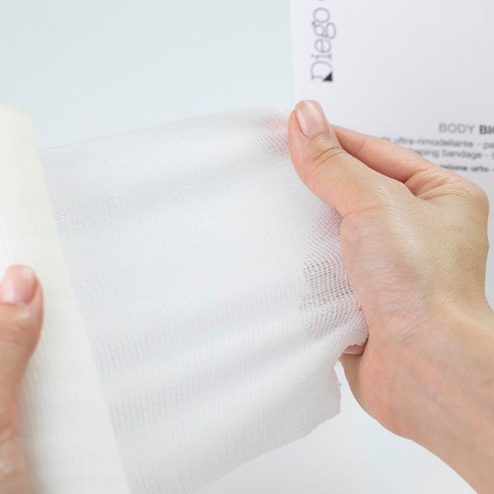 - Partendo dal centro della coscia e procedendo verso l'alto, avvolgere il bendaggio pre-imbevuto intorno alla gamba, con una rotazione a spirale, facendo attenzione che i fogli di benda non si sovrappongano per più di 1-2 cm; avvolgere 2-3 volte intorno ai glutei e ai fianchi, quindi coprire tutto l'addome; passare all'altra gamba.