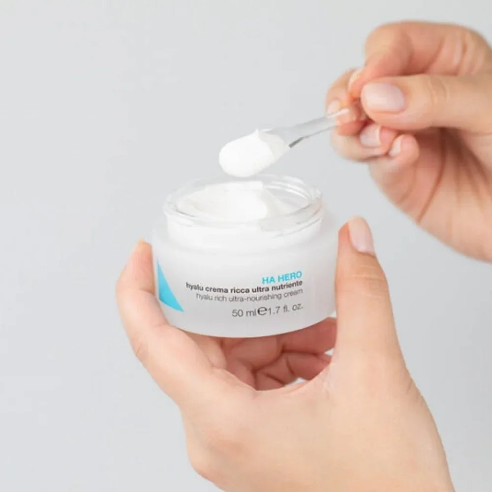 Ha Hero Hyalu Crema Ricca è una crema viso rigenerante, ideale per la pelle che necessita di intensa idratazione, nutrimento e protezione dai fattori esterni (freddo, vento, aria condizionata).