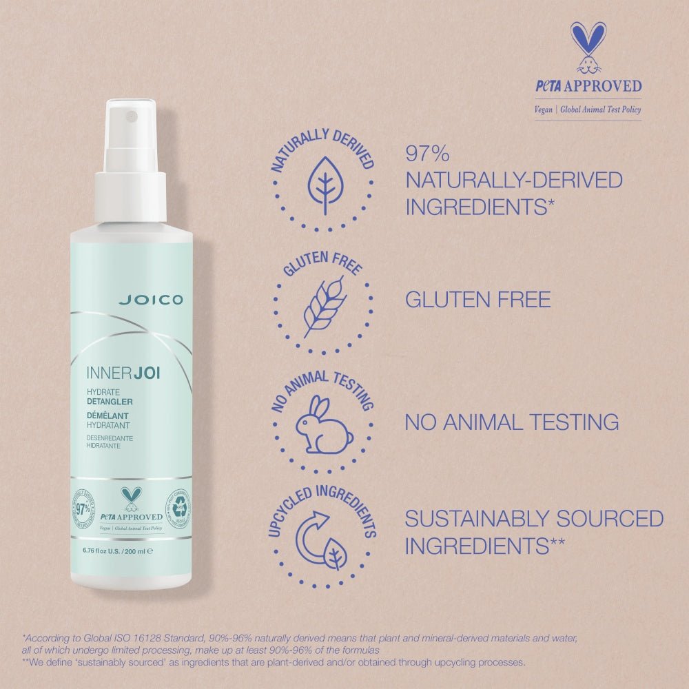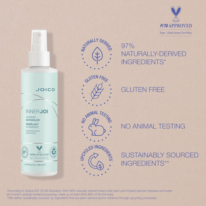 Joico InnerJoi Hydrate Detangler è una lozione spray vegana e idratante per capelli secchi e opachi. La formula leggera e rinfrescante idrata i capelli in modo eccezionalmente efficace e questo è evidente dopo un solo utilizzo.