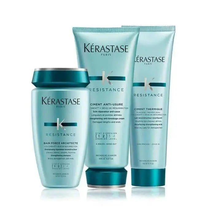 Shampoo, balsamo e latte strutturante per riparare e rinforzare la fibra dei capelli danneggiati e indeboliti. Un trattamento che ricostruisce la struttura del capello, protegge il capello da rotture, ripara le doppie punte e previene i danni dal calore degli strumenti a caldo per lo styling. Kerastase Resistance Kit Ricostruzione Professionale capelli danneggiati contiene: