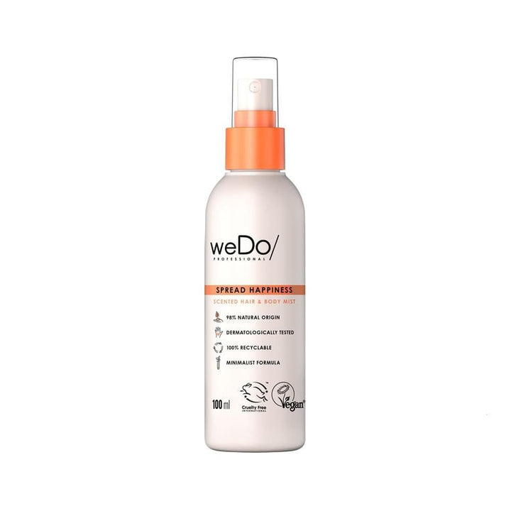 anche questo spray profumato per corpo e capelli contiene pochi ingredienti, ma altamente performanti e che garantiscono un risultato professionale. Bastano pochi spruzzi di questo prodotto su corpo e capelli per ricevere una piacevole sensazione di benessere. La fragranza di weDo Professional Spread Happiness molto delicata, pertanto se si desidera una durata prolungata necessario ripetere l'applicazione un paio di volte al giorno.