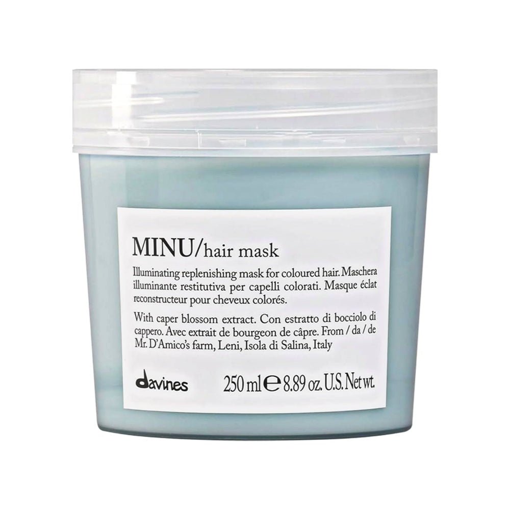 - Aplique Davines Essential Haircare Minu Hair Mask nos cabelos secos com uma toalha após o shampoo Minu.