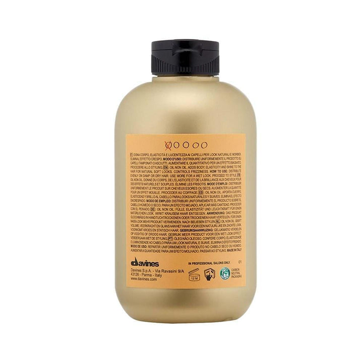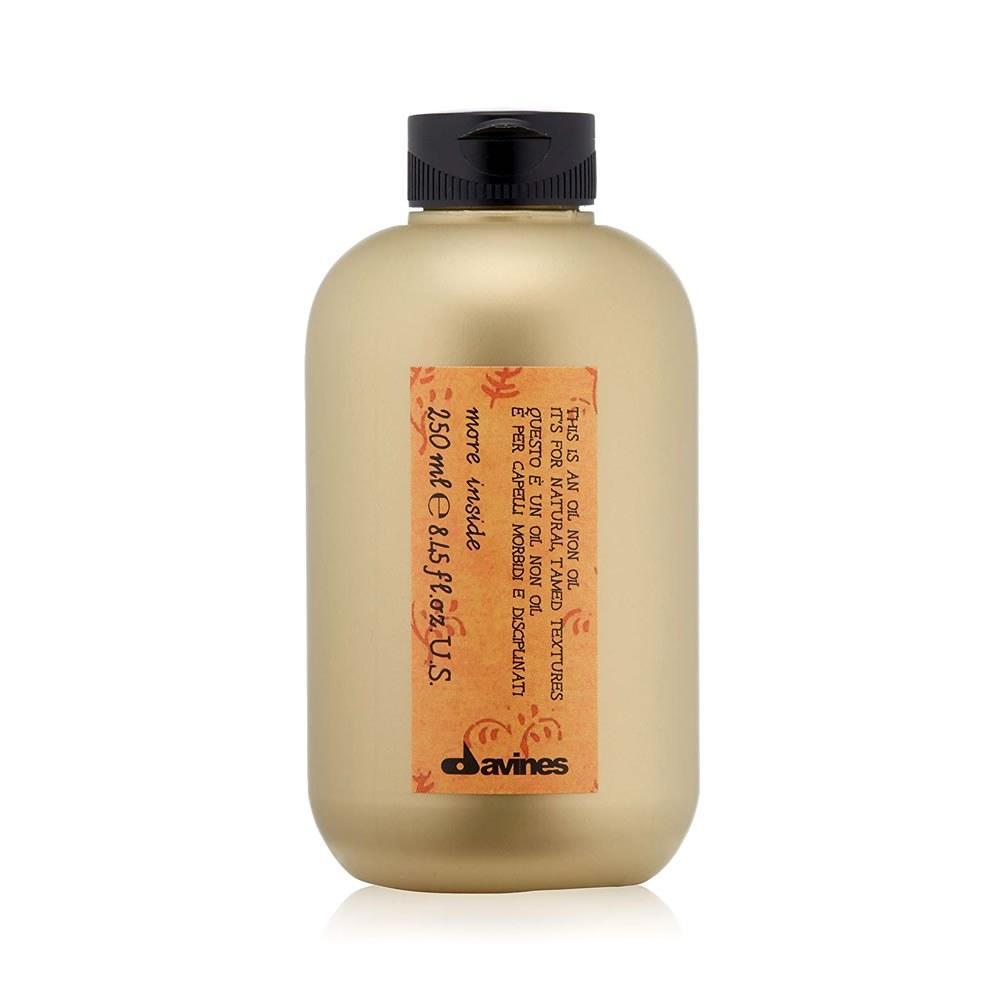 Davines More Inside Oil Non Oil , gel fluido sem fixação. Ideal para looks naturais e condicionados. Indicado para quem deseja cabelos macios e disciplinados. Se você quiser obter mais controle, use a mousse de volume e adicione óleo sem óleo.