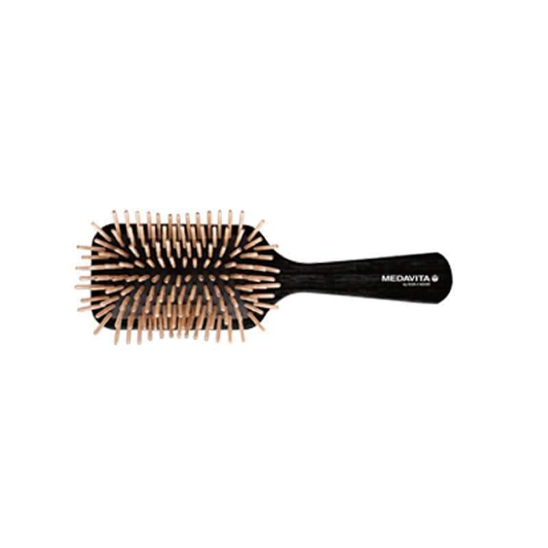 Escova de madeira com cerdas muito compridas que ajuda a desembaraçar suavemente o cabelo facilitando o pentear de grandes madeixas, a escova permite pentear o cabelo ainda húmido sem o partir.